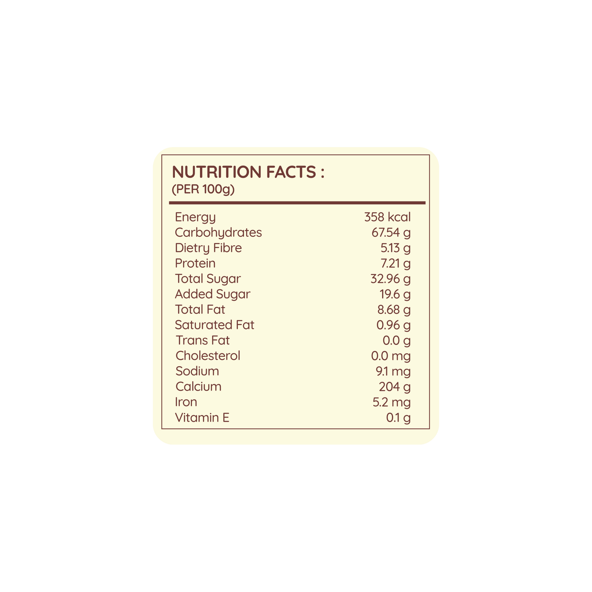Ragi Flour, Oats, Dates Powder, Almond Powder, Jaggery Powder, Cocoa Powder.